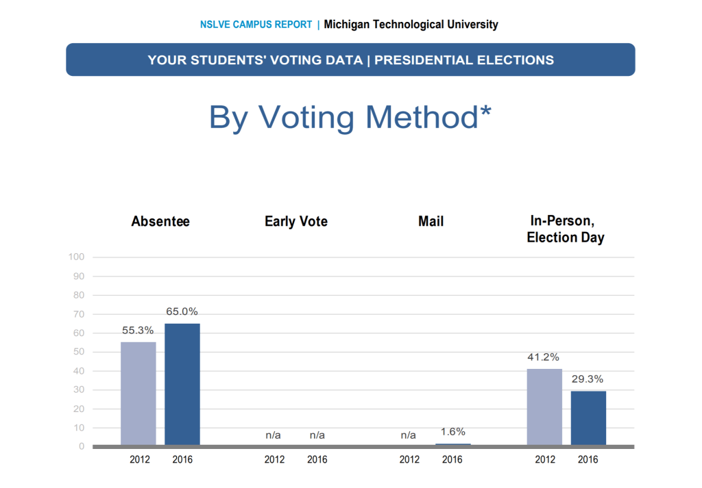 MTU student voter participation rates may be so much lower than the national average across participating students in the NSLVE study because of the rural location of our campus. The majority of Michigan Tech students vote absentee. As you can see in the image below, in the 2016 election, 65% of Michigan students voted by absentee method compared to only 29.3% in person.