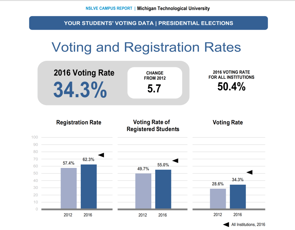 Since the United States of America consists of a Representative Democracy, voting is an important form of civic engagement in our democratic society. However, approximately only 56% of the voting age population in the United States participates according to an NSLVE study. Statistically, older people vote at a much higher rate than the younger population does. Compared to Universities at a national level, Michigan Technological University voter participation is well below the average as you can see in the image below. Even after in increase in voter participation since the 2012 election, Michigan Tech still only had a 34.3% voting rate in the 2016 election. The voting rate for other institutions was around 50.4%. Both registration and voting rates at Michigan Tech are much lower than other institutions.